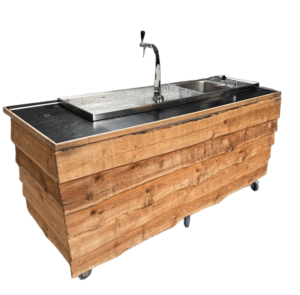 Incl. koolzuur bij afname bier(2.15x0.85 mtr)Decoratieve grote tap – bar met ruw houtIncl. spoelbakAfmetingen (m) : 2.15 × 0.87 × 1.50