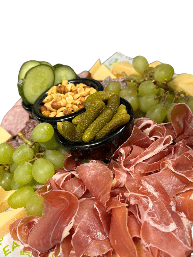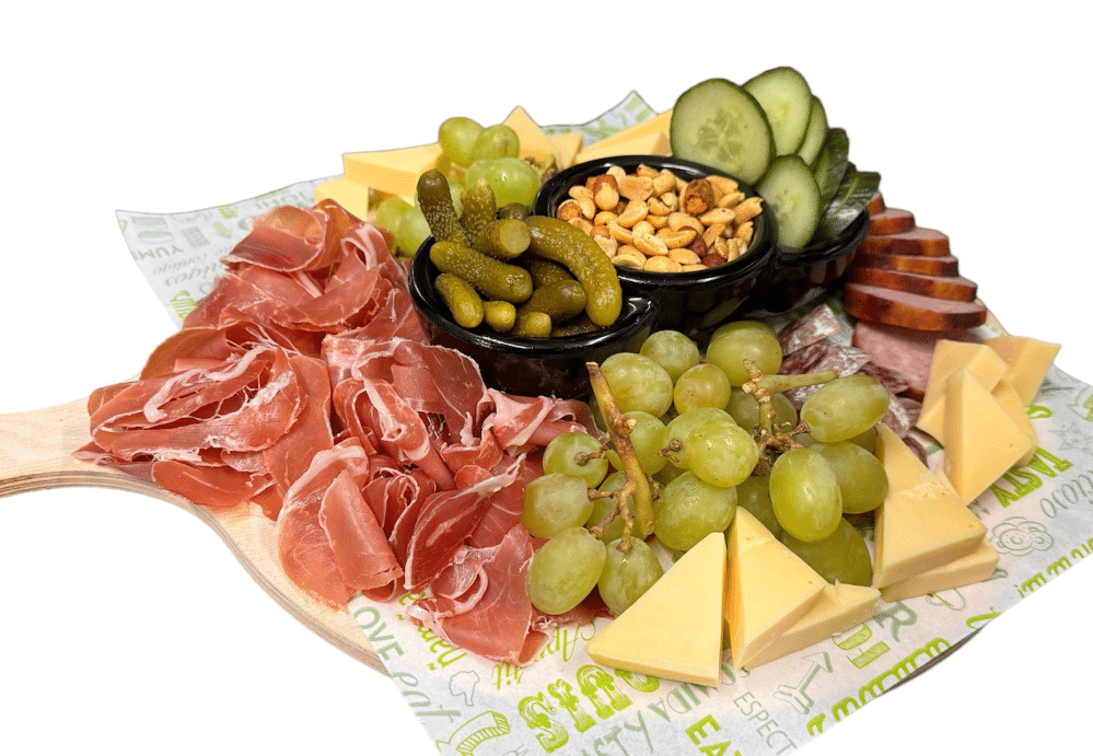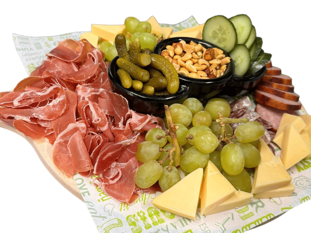 Borrelplank met diverse soorten lekkere knabbel hapjes:Goed voor ongeveer 10 -15 personenpuntjes kaasplakjes gedroogde worstplakjes grillworstplakjes seranohampindamixdruivenkomkommermini augurken