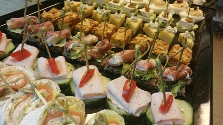 (schaal á 50 stuks)met zalm gevuld eicanapé gerookte forelcornetje van salami gevuld met roomkaaswrap met tonijn, ruccola, roomkaas & bosuigevuld ei classickleintje quichewrap gerookte zalm & kruidenkaas
