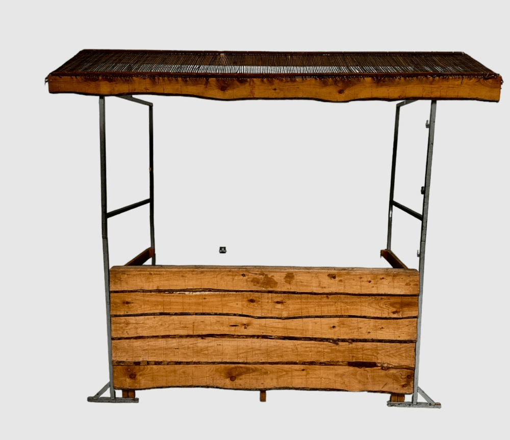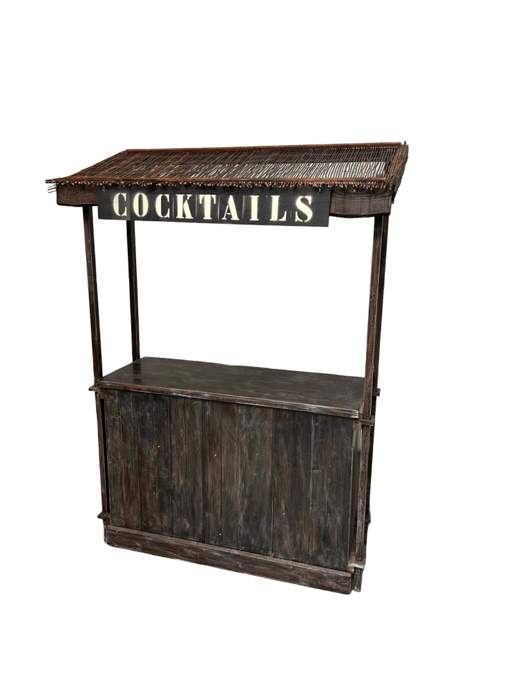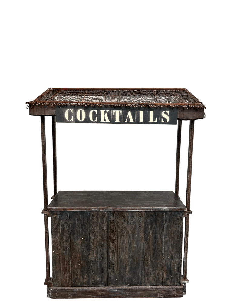 Cocktail bar te huur met rieten dakjeSfeervol met bord ‘cocktails’Is volledig demontabel en inklapbaar.maat werkblad: 140×55 cmHoogte werkblad: 1.04 mtr