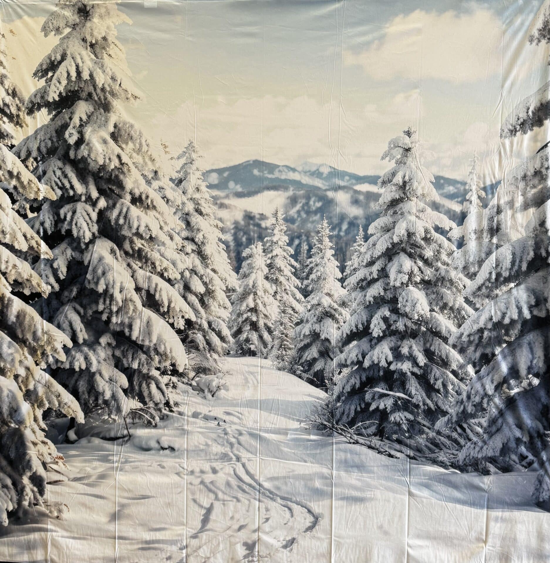 Winters Alpen landschap met besneeuwde bomenLeuk voor Apres Ski decor of Kerst aankledingmaat doek: 3×3 mtr.Wordt geleverd incl. voeten en staanders om het doek aan te hangen.