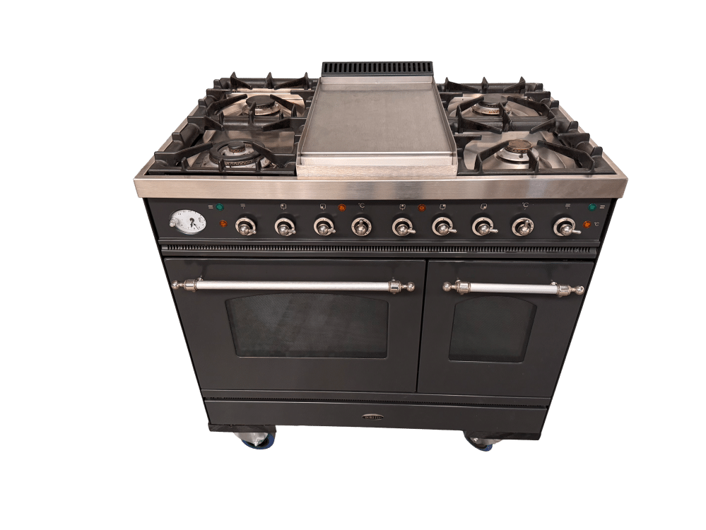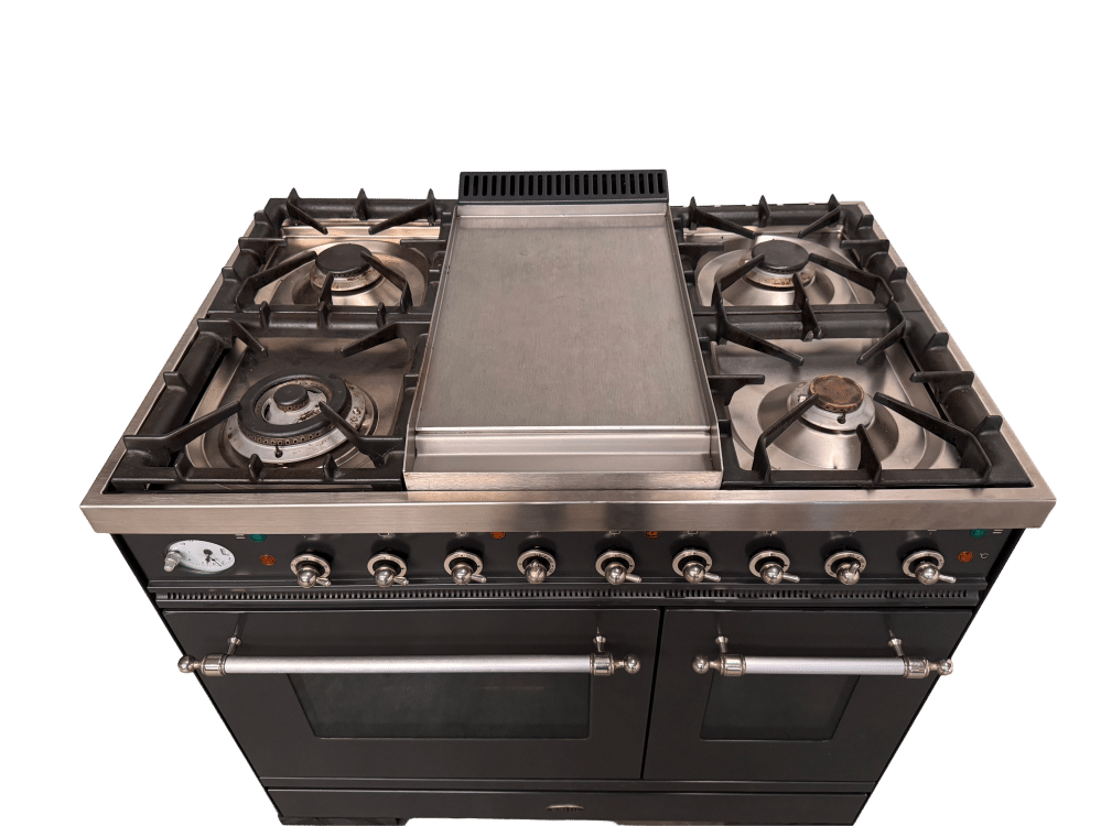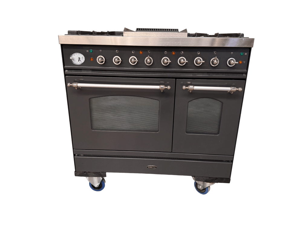 Deze Boretti Oven - fornuis is een 100 cm breed gasfornuis met 2 ovens: 1 multifunctionele oven met 8 ovenfuncties en 1 conventionele oven met draaispit. Het kookvlak beschikt over 4 hoogwaardige messing gasbranders. De Fry Top/Teppanyaki plaat is eenvoudig schoon te maken dankzij het aflopende ontwerp en de geul onderaan. Dit Boretti fornuis is tevens voorzien van zware robuuste gietijzeren pannendragers en vonkontsteking met thermokoppelbeveiliging.