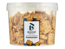 Kaaskantjes zijn krokant gebakken koekjes van bladerdeeg, overbakken met een laagje gerijpte Goudse kaas. Ton van 750 gramm