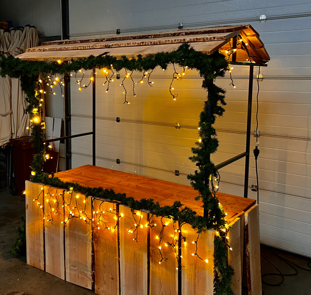 Decoratieve KerstkraamMet ruwhouten ombouwMet ruw houten dakjeMet Kerst GuirlandersMet Kerstverlichtingbreedte: 2.00 mtr