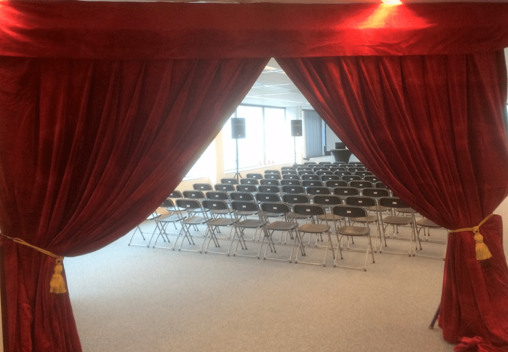 Kleur: RoodMateriaal: Vlamwerend fluweelAfmetingen (m) : 4.00 × 2.20Incl. wine-up statieven en trus systeemIncl. op- en afbouw